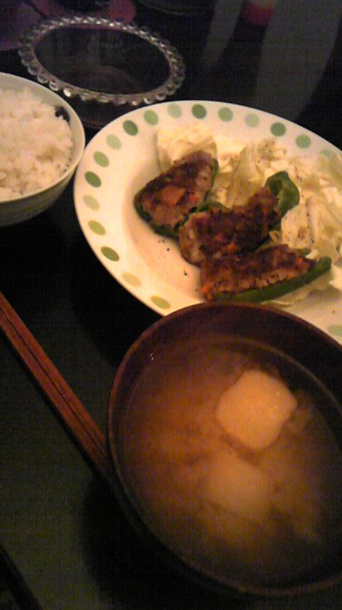 夕飯にピーマンの肉詰めと麩の味噌汁を作りました。